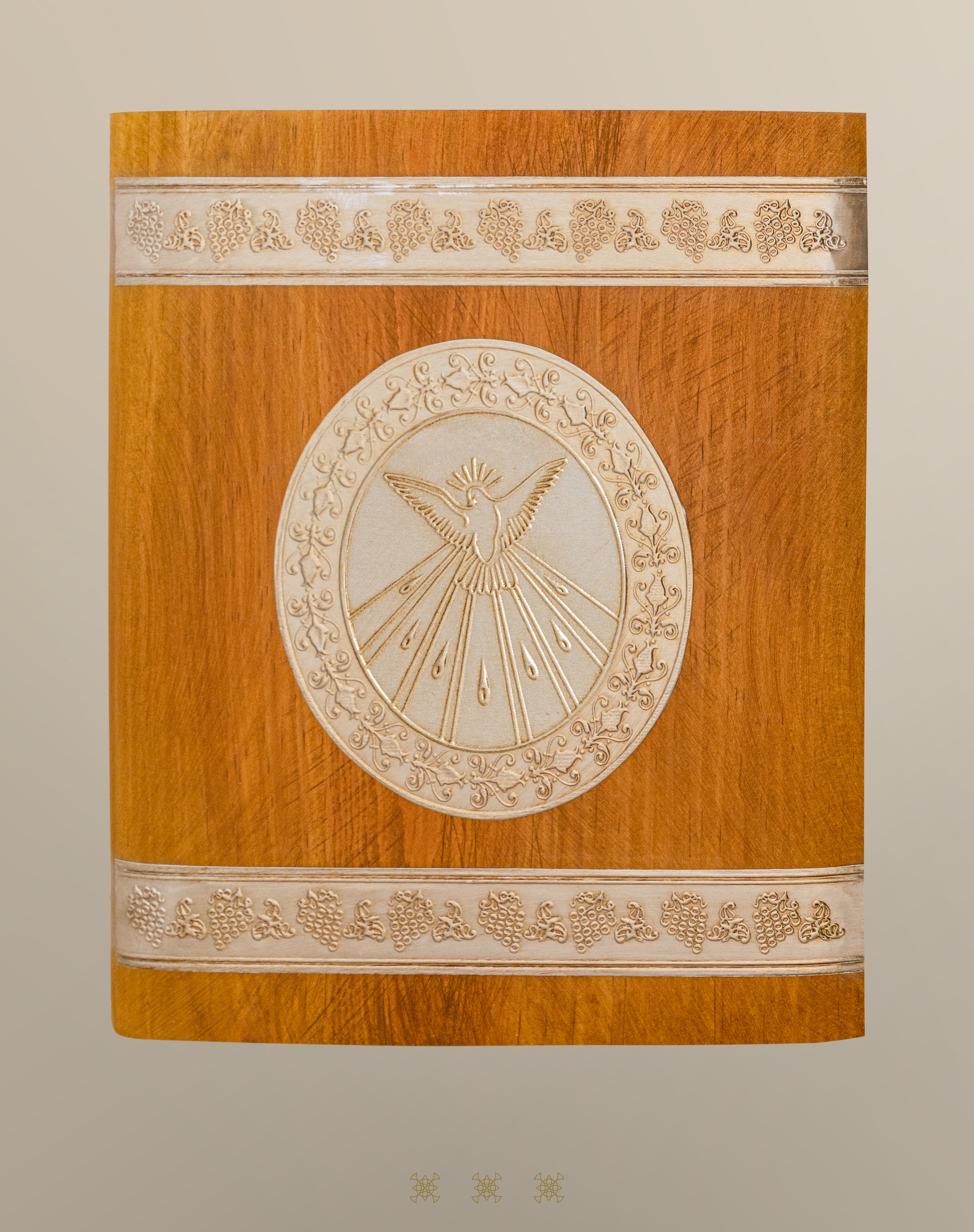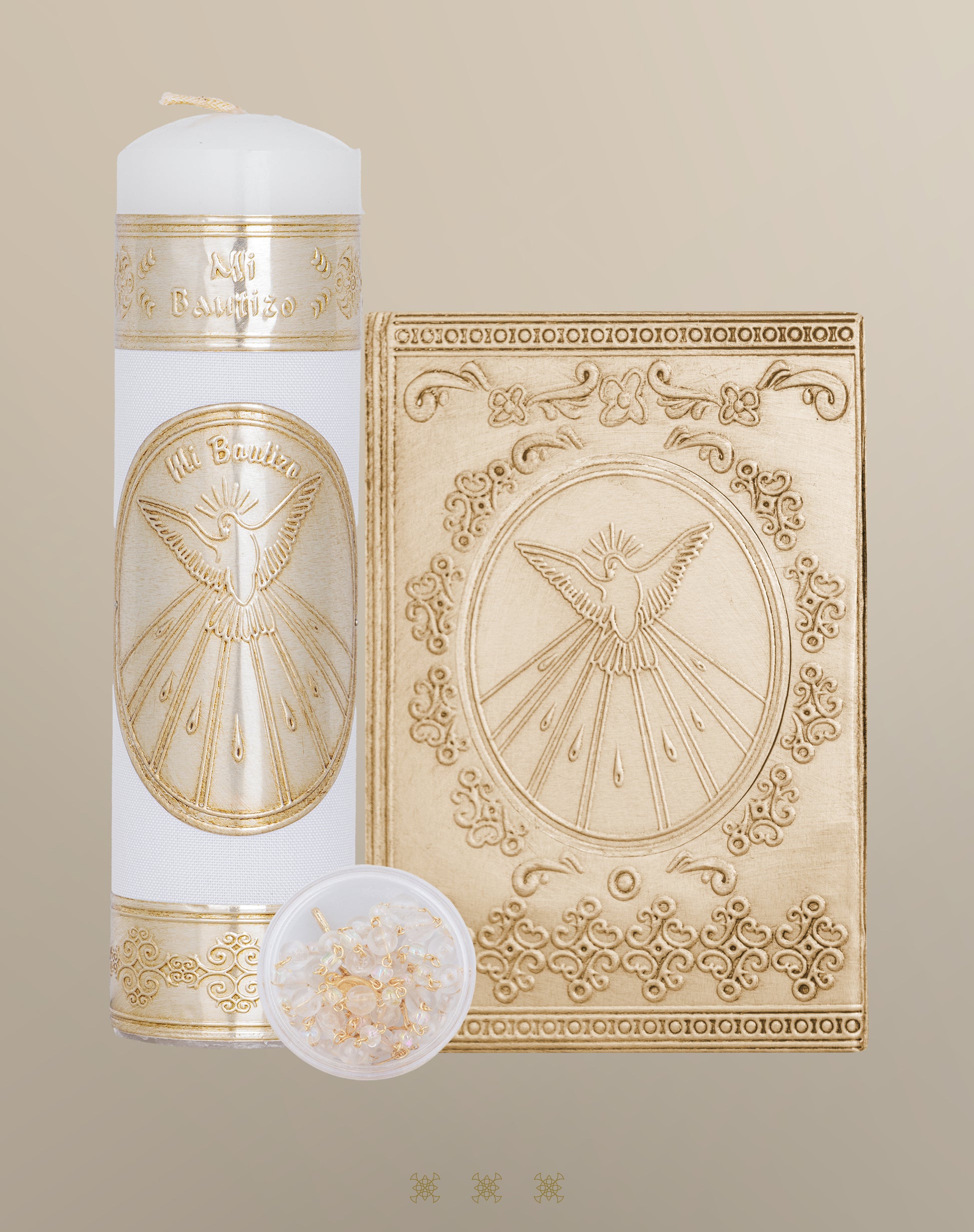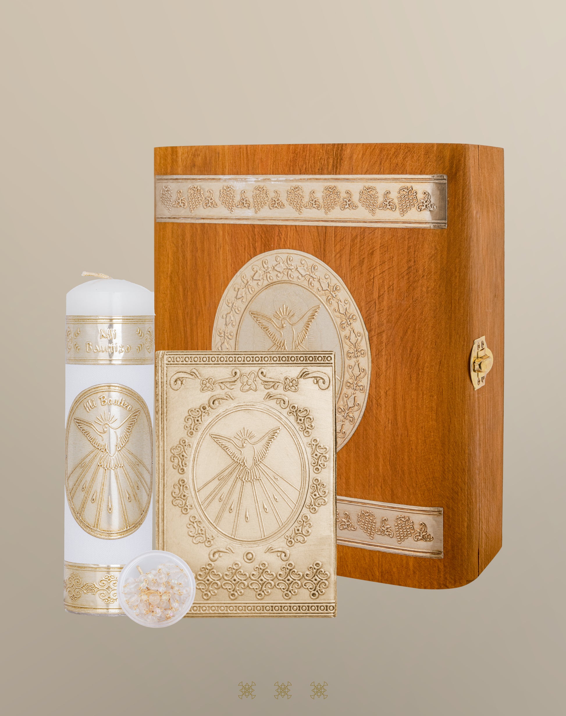 Set para Primera Comunión con cofre de madera. Decorado con imagen religiosa del Espíritu Santo, elaborado en repujado artesanal color dorado. Incluye: Cofre de madera, Biblia Latinoamericana, vela y rosario.