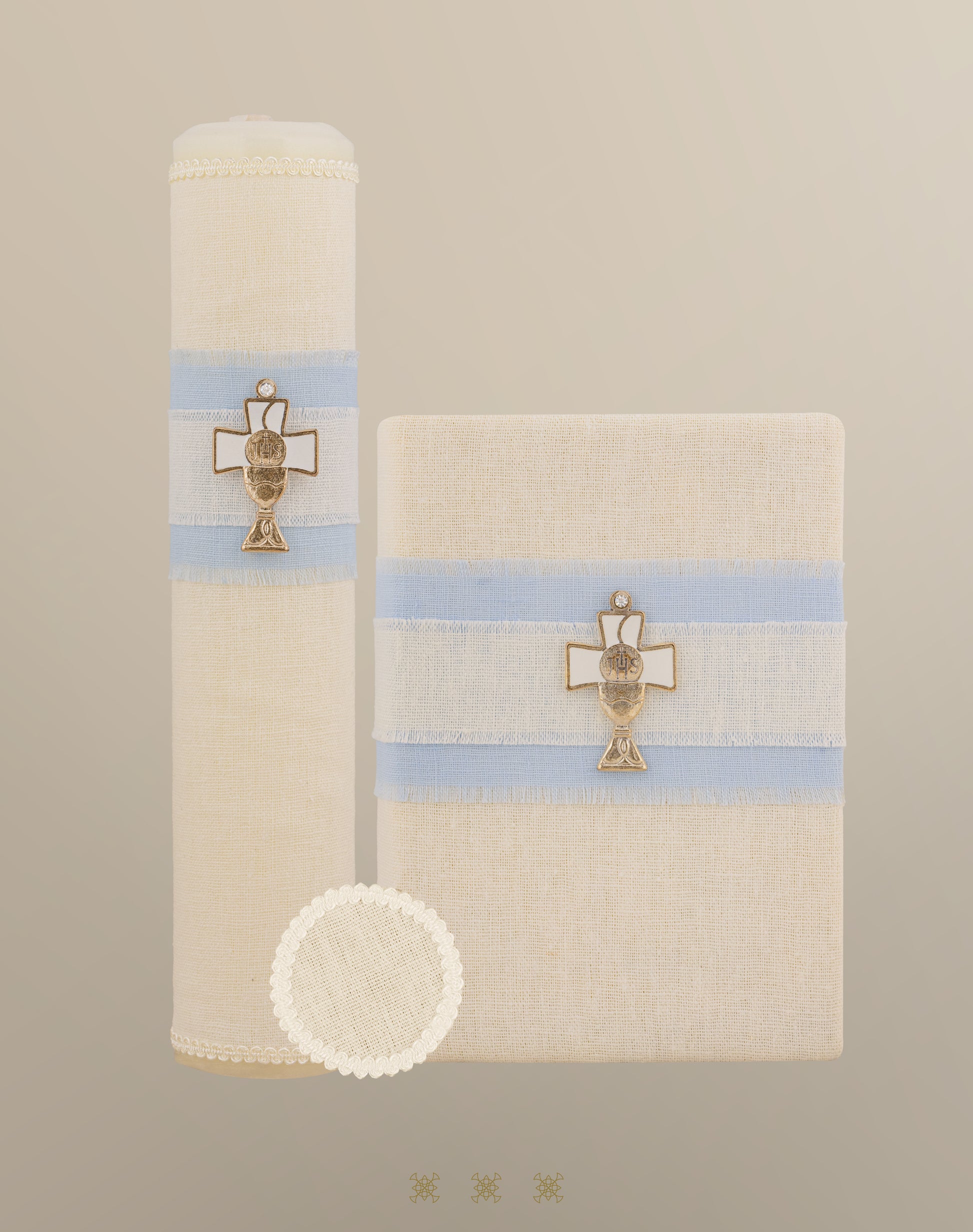 Juego de vela para primera comunión color hueso con aplicación textil y cruz con medalla de Cáliz color dorado. Incluye: Biblia latinoamericana, vela y rosario.