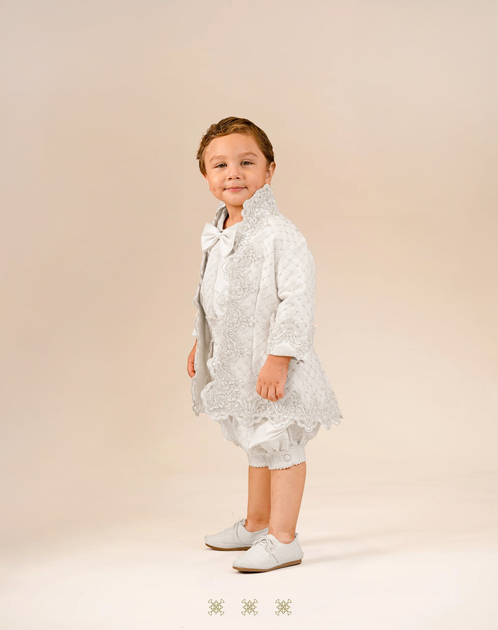 Ropón de bautizo para niño estilo "Príncipe" color blanco, camisa de manga larga, moño desmontable, pantalón bombacho con detalles brillantes color plata. Saco con aplicación de encaje.