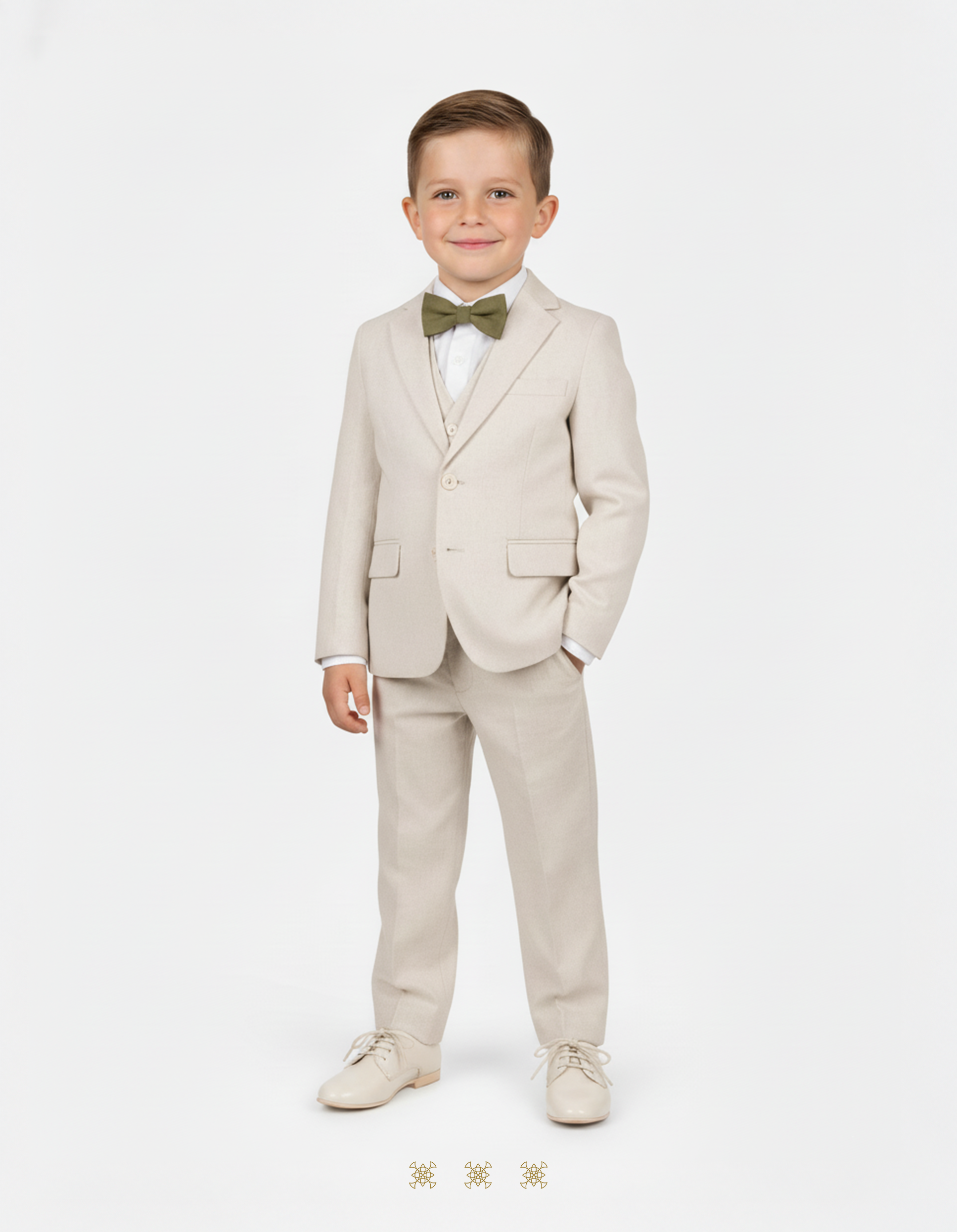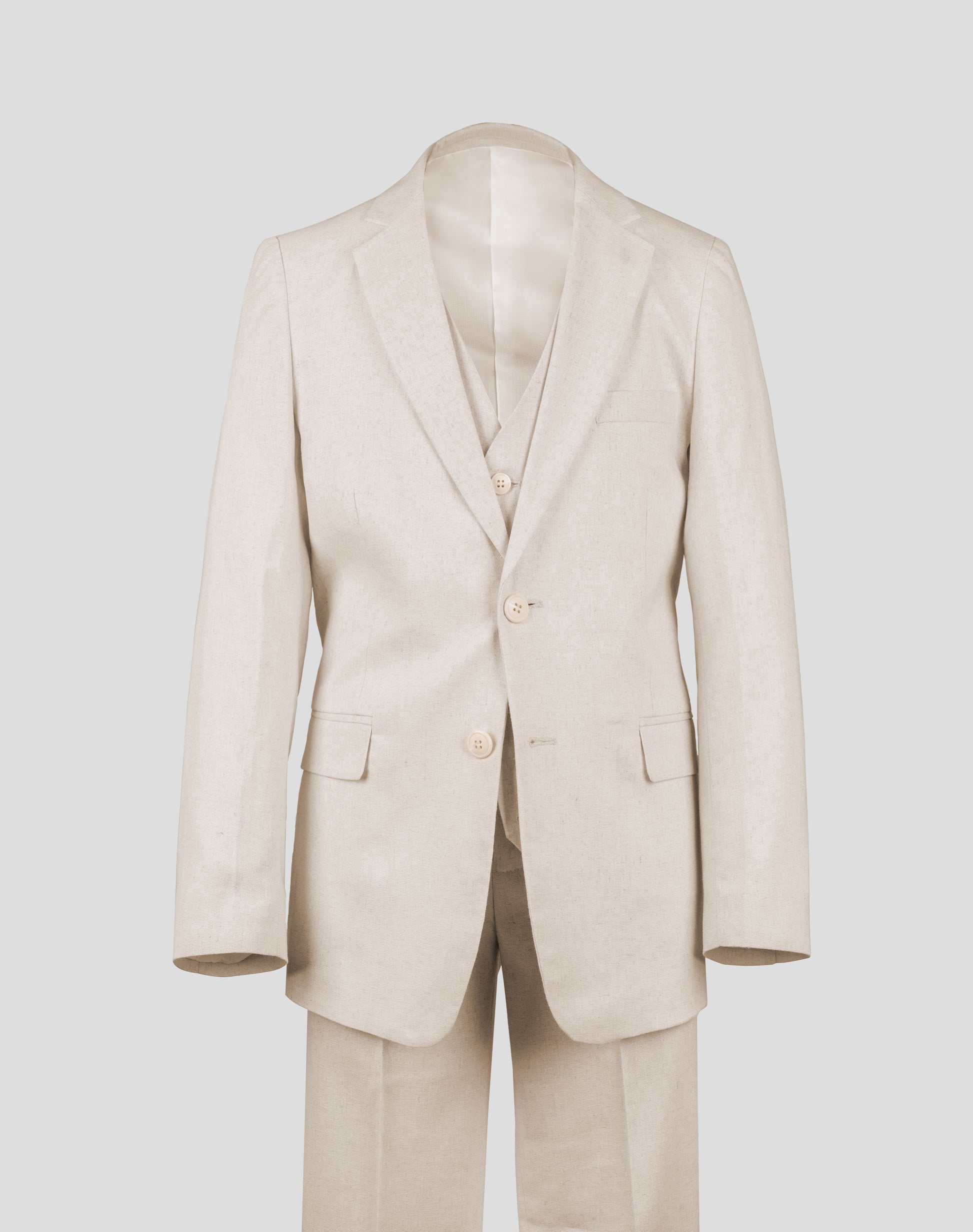 Traje infantil de 3 piezas color arena, saco con solapa de muesca, recto de dos botones, bolsillo superior de lado izquierdo para pañuelo y dos bolsillos con tapa de cartera en costados. Pantalón con broche de gancho y cremallera, bolsillos laterales sin botón y traseros con botón.