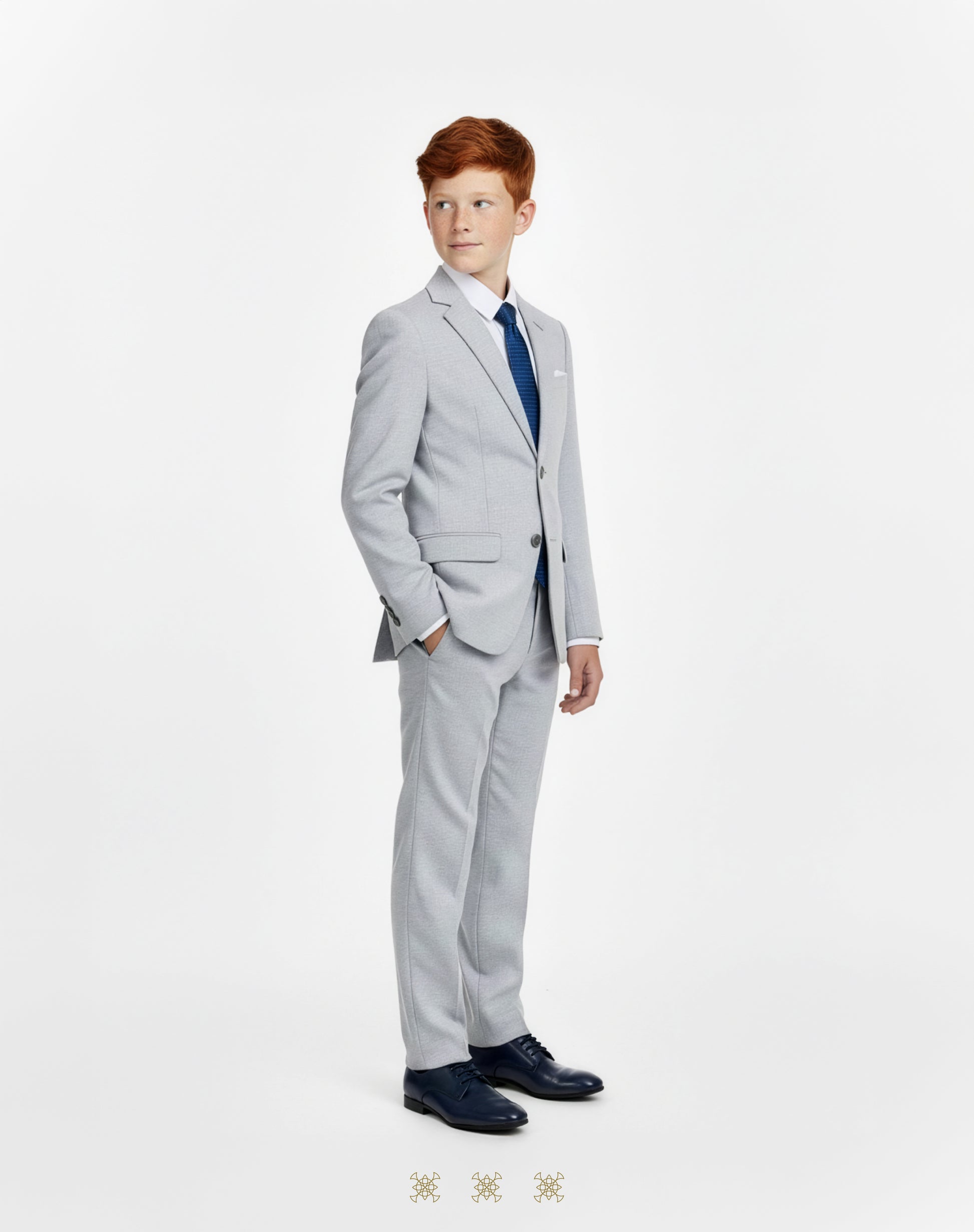 Traje de primera comunión color gris 2 piezas, saco con dos botones en la parte delantera, puños con 3 botones, bolsillo superior de lado izquierdo para pañuelo y dos bolsillos con talle ribete en costados. Pantalón con botón y cremallera.
