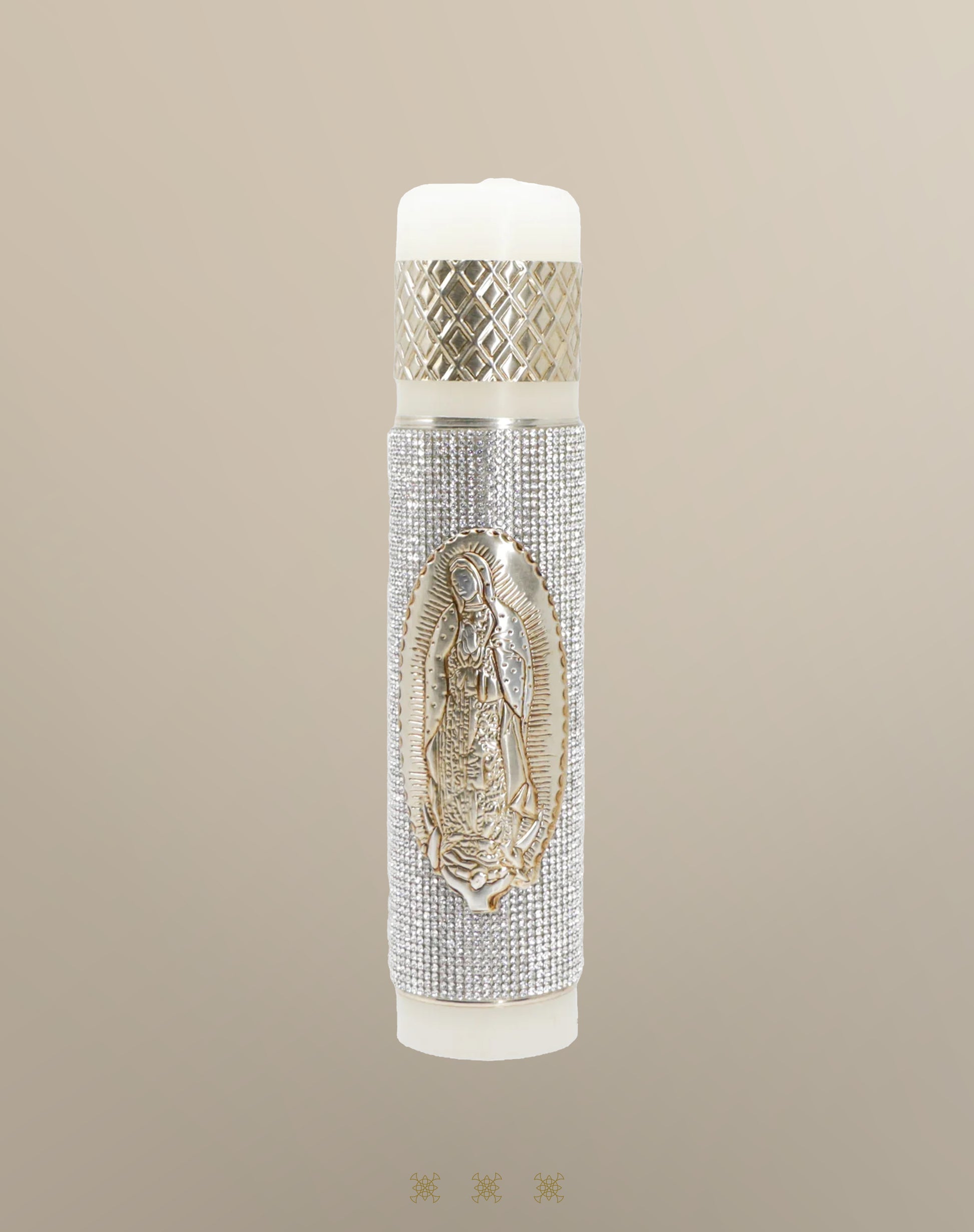 Vela con brillos color plata en repujado con diseño la Virgen María color dorado, mide 22 cm de alto x 16 de diámetro.