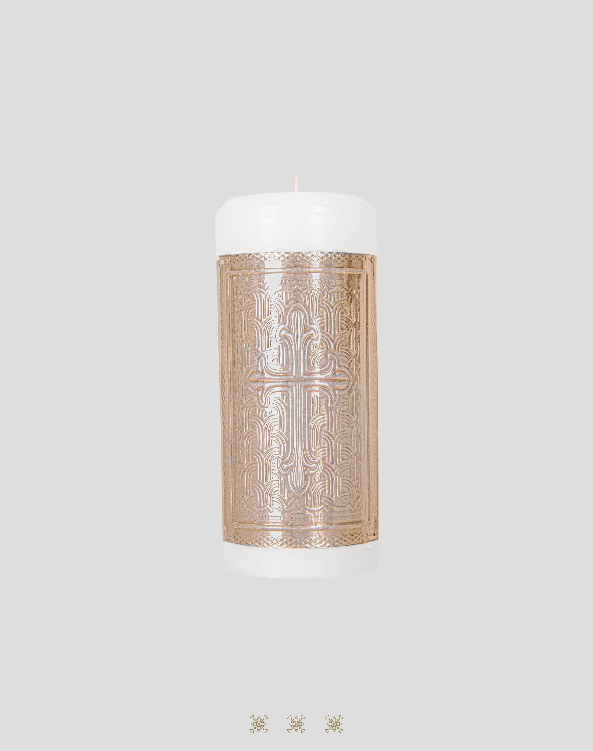 Vela con imagen de cruz en repujado color dorado, mide 9 cm alto x 4 cm diámetro.