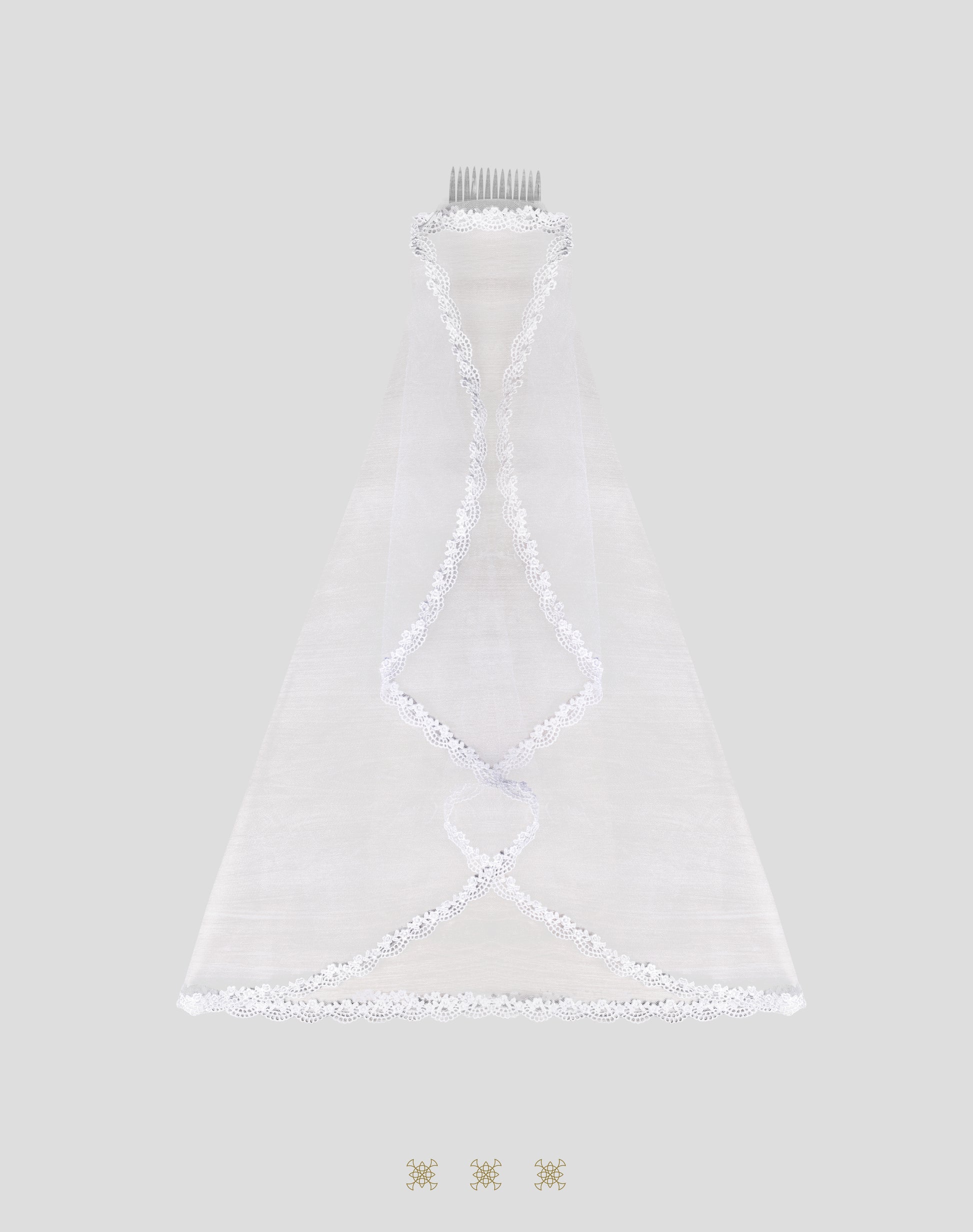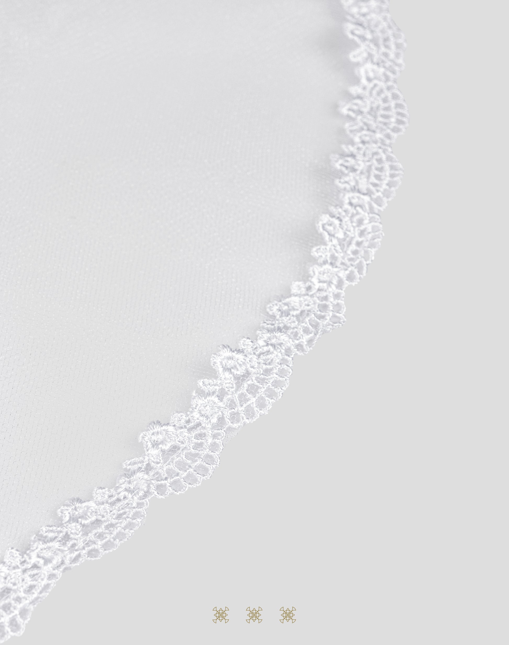 Velo ovalado juvenil color blanco con aplicación de encaje festoneado.