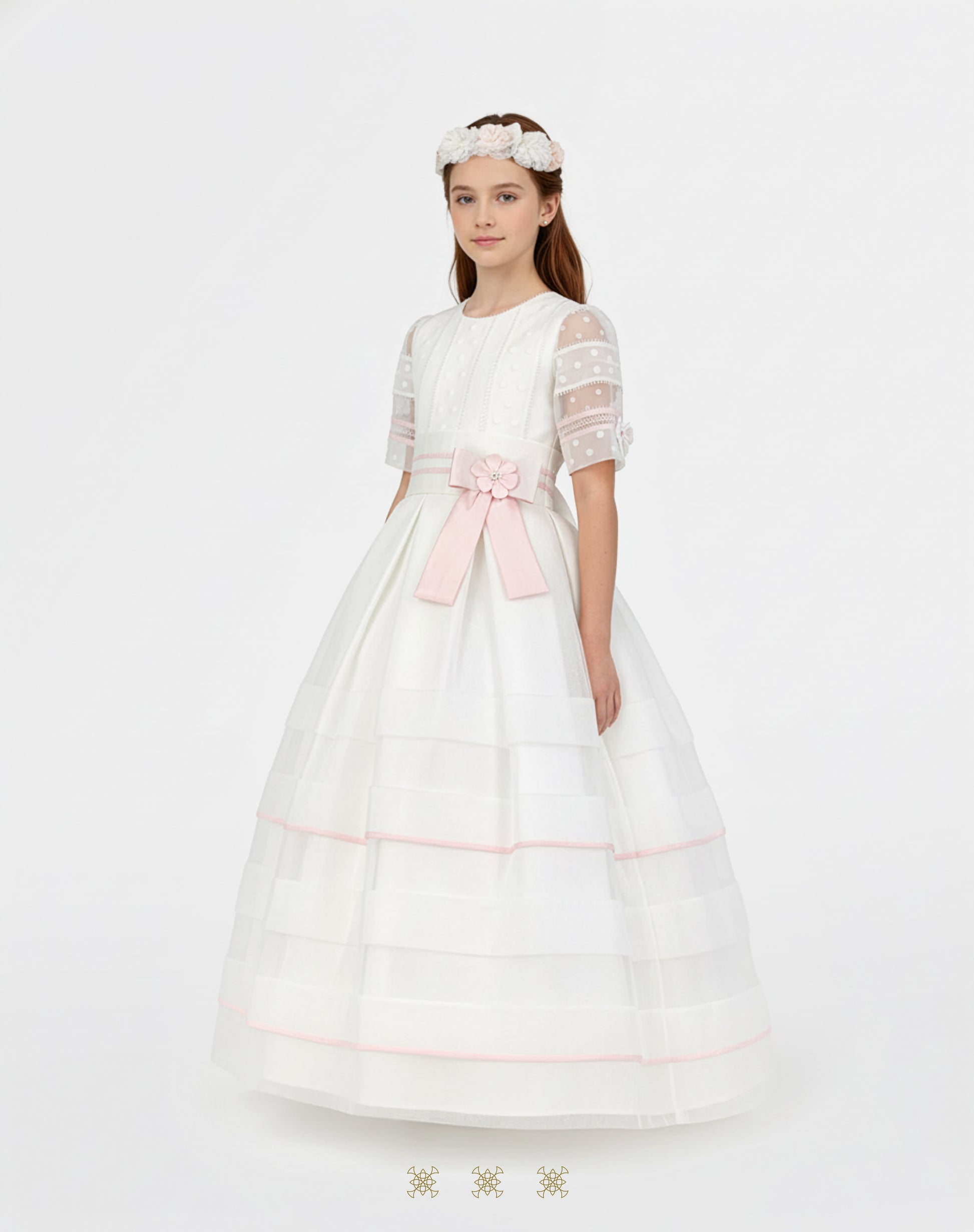 Vestido para Primera Comunión estilo español color hueso. Con manga 3/4. Elaborado en fina organza, falda con 2 capas con ribete de satín color rosa y detalles de alforzas. Peto con páneles de algodón bordado y páneles de organza, ensamblados con gabeado hecho a mano. Mangas con páneles de organza, algodón y satín ensambladas con gabeado a mano. Aplicación de moño en puño de mangas. Fajo con vivos de satín rosa ensamblado en gabeado y aplicación de moño con flor artesanal desmontable.