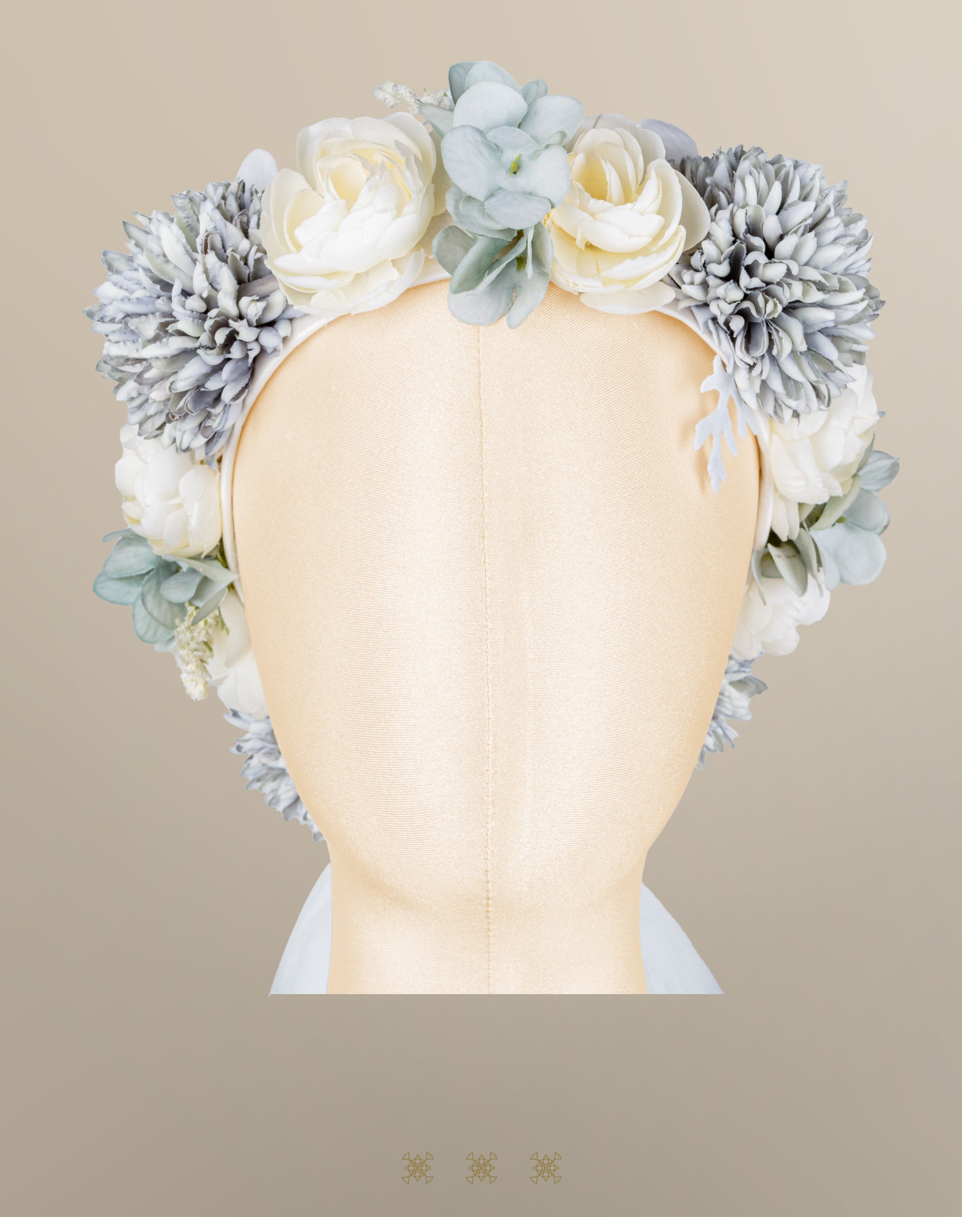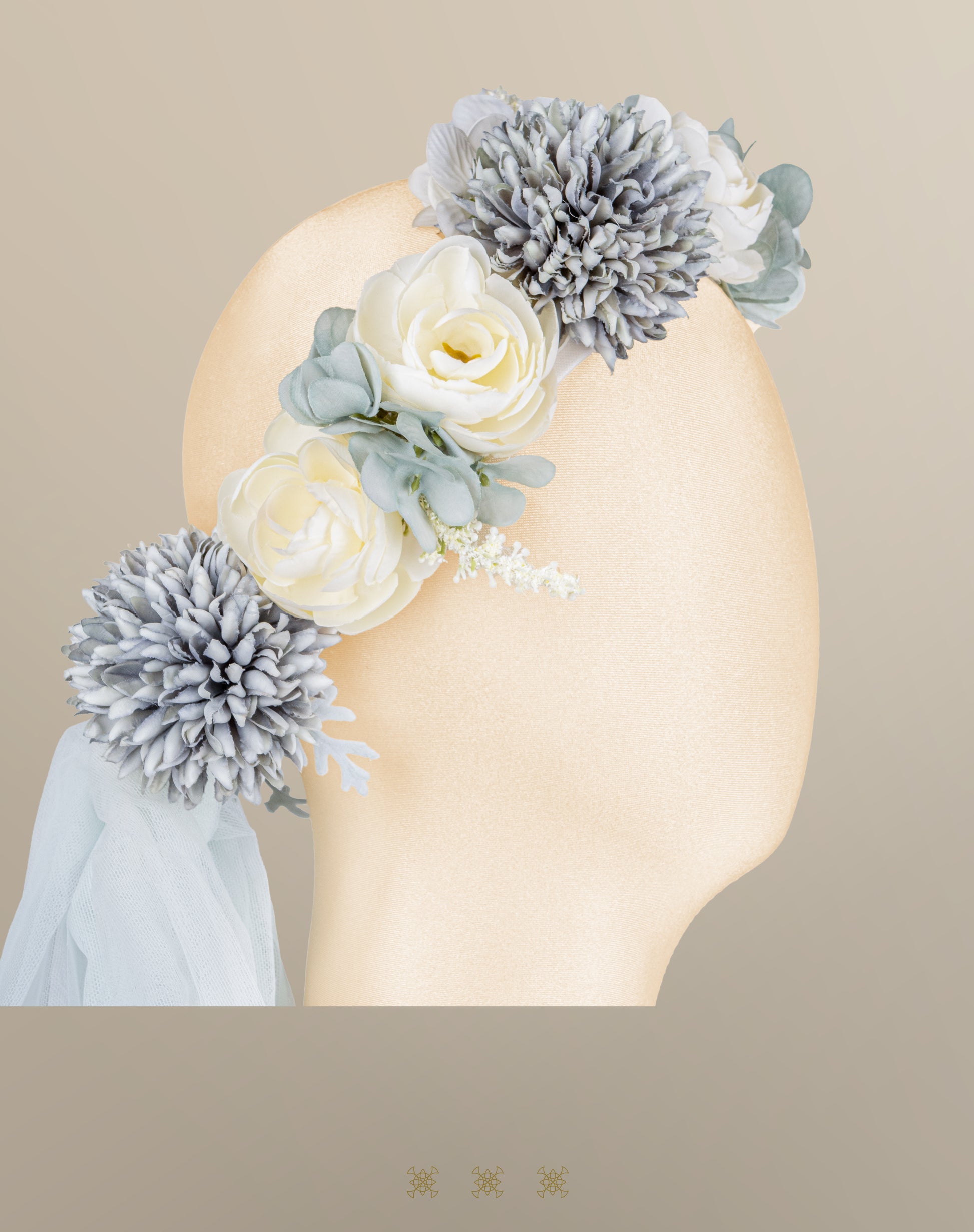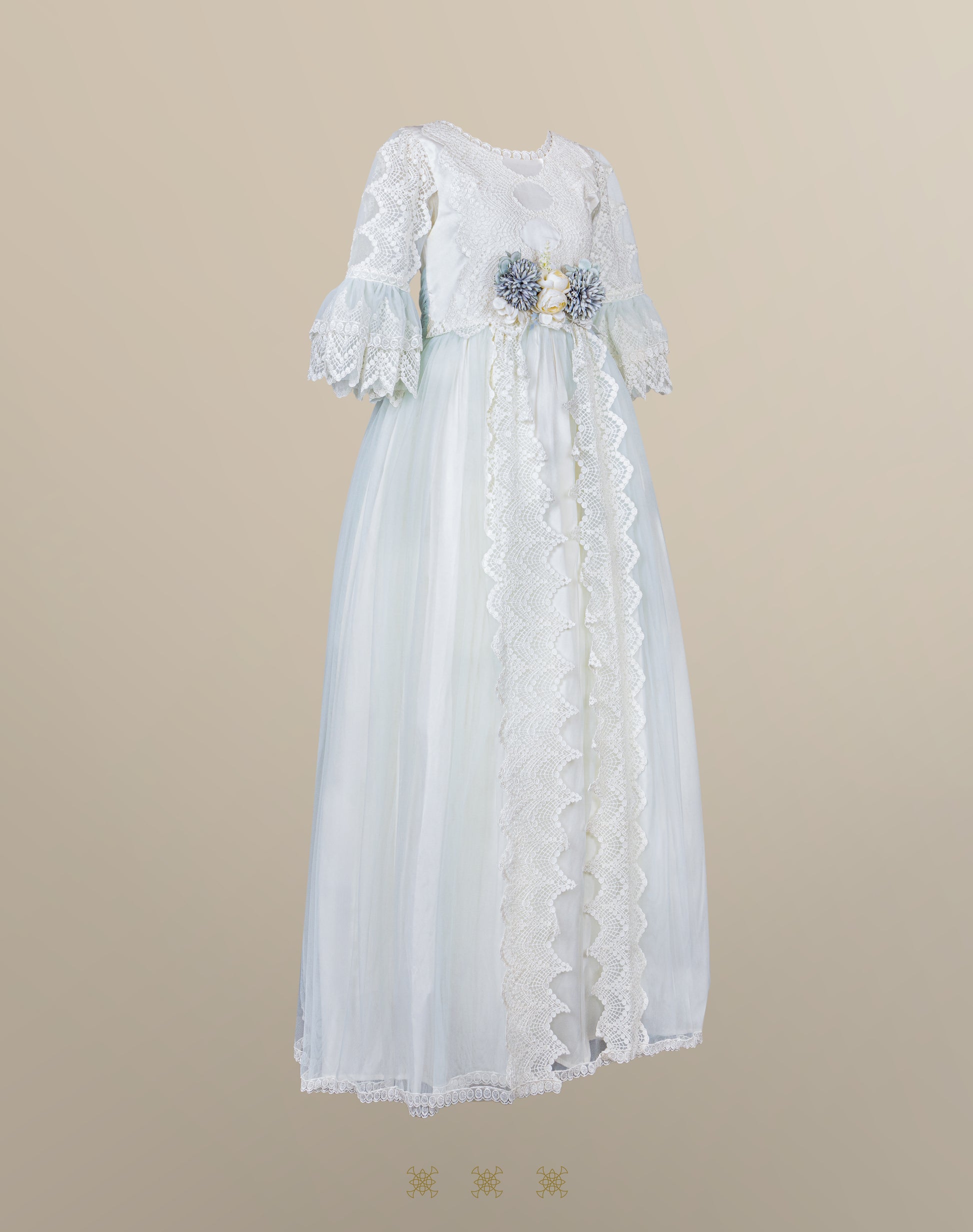 Vestido de color hueso con borgados y encaje. Capa superior de falda con mesh color azul verdoso. Mangas 3/4 de tul con acabado en encaje estilo boho. Fajo con flores decorativa en el fajo. Incluye corona de flores a juego con el fajo y listón de mesh para mejor ajuste.