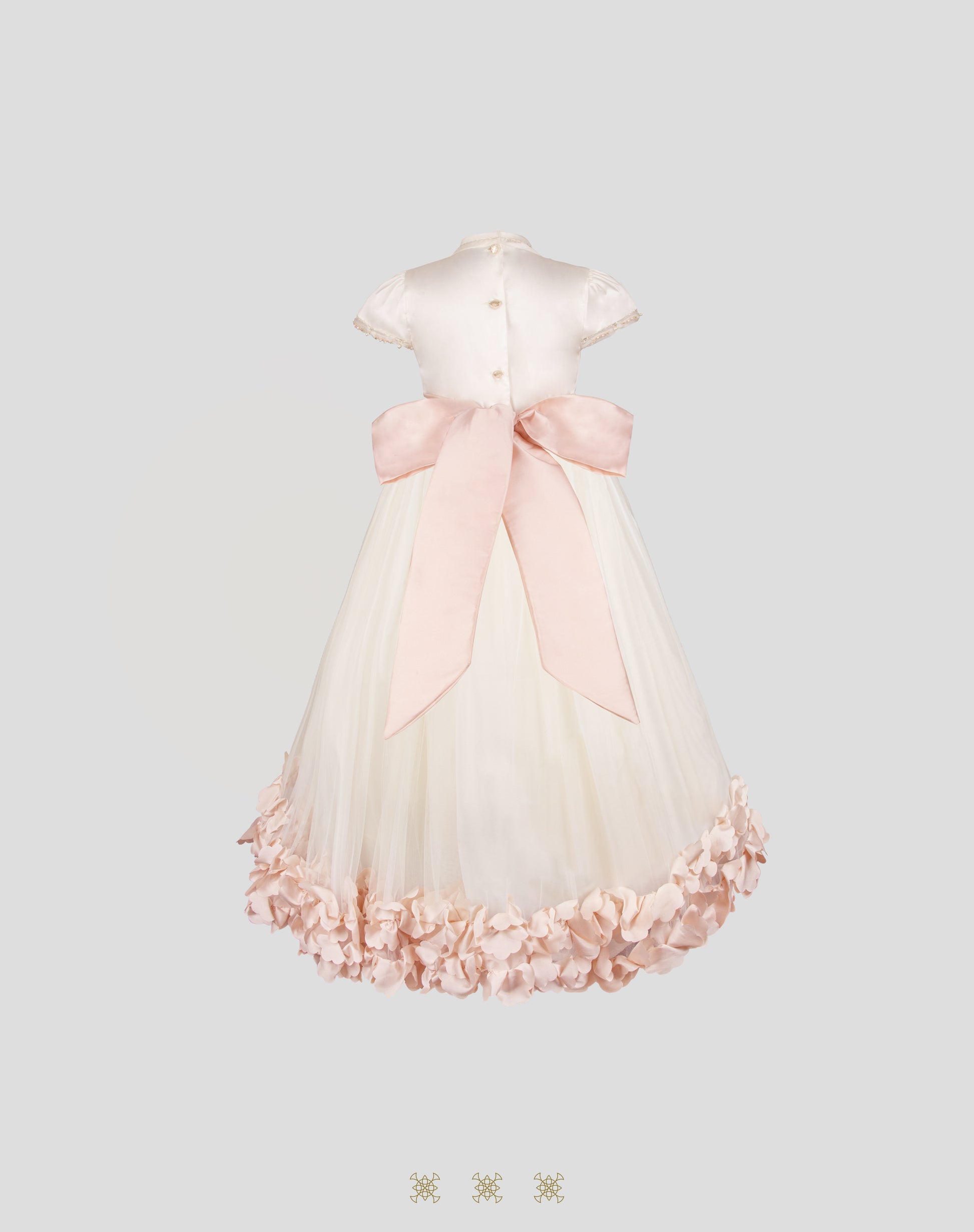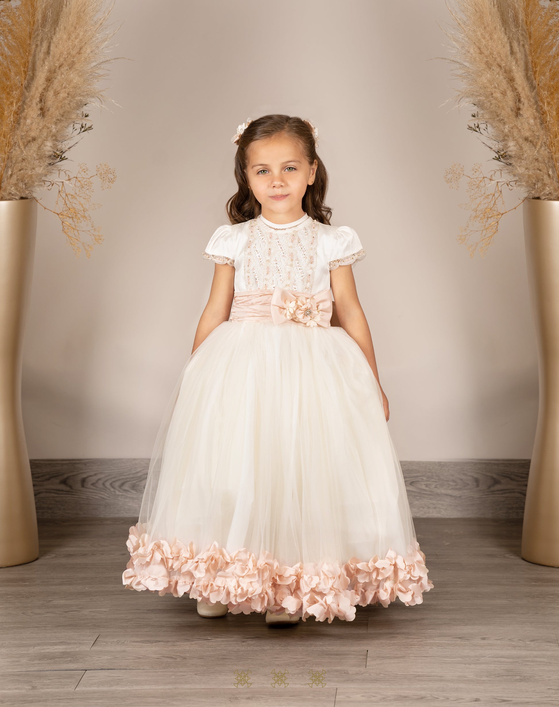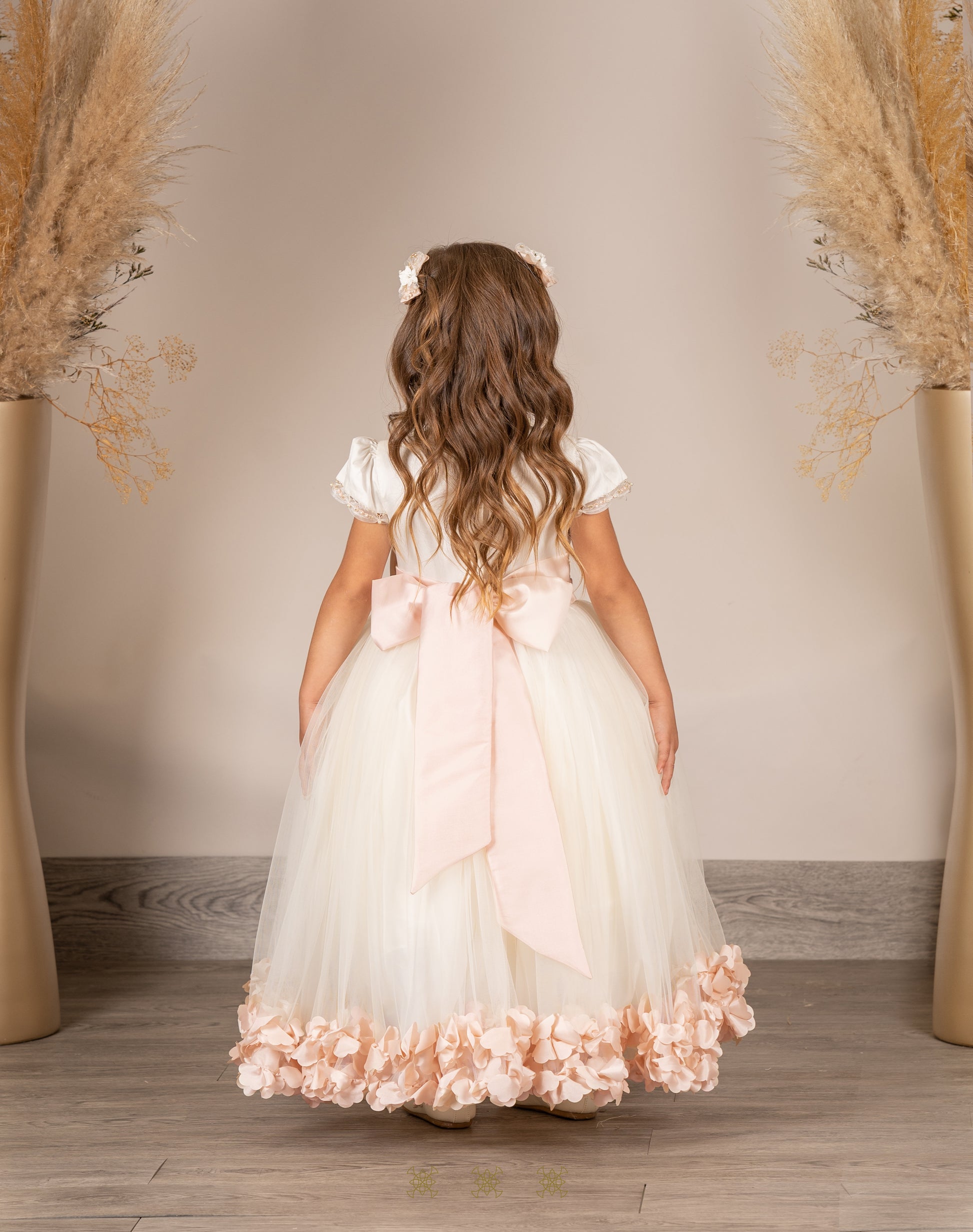 Vestido infantil de alta costura, manga larga. Con peto bordado a mano con flores artesanales y perlas. Fajo en color rosa con moño desmontable con flores artesanales y perlas. Falda de tul liso con flores al final del vestido.