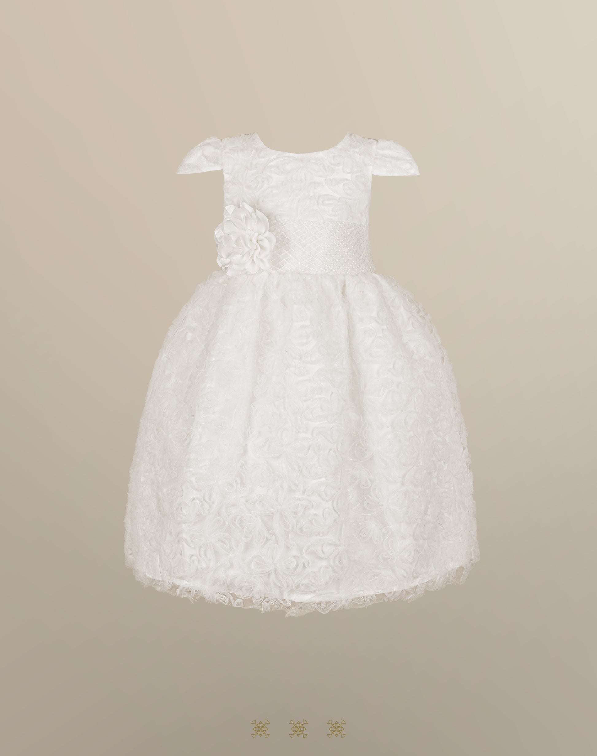 Vestido infantil color hueso con manga corta, peto con ornamentados con flores, fajo floral y listón y detalles brillantes, falda de tul con ornamentados con flores.