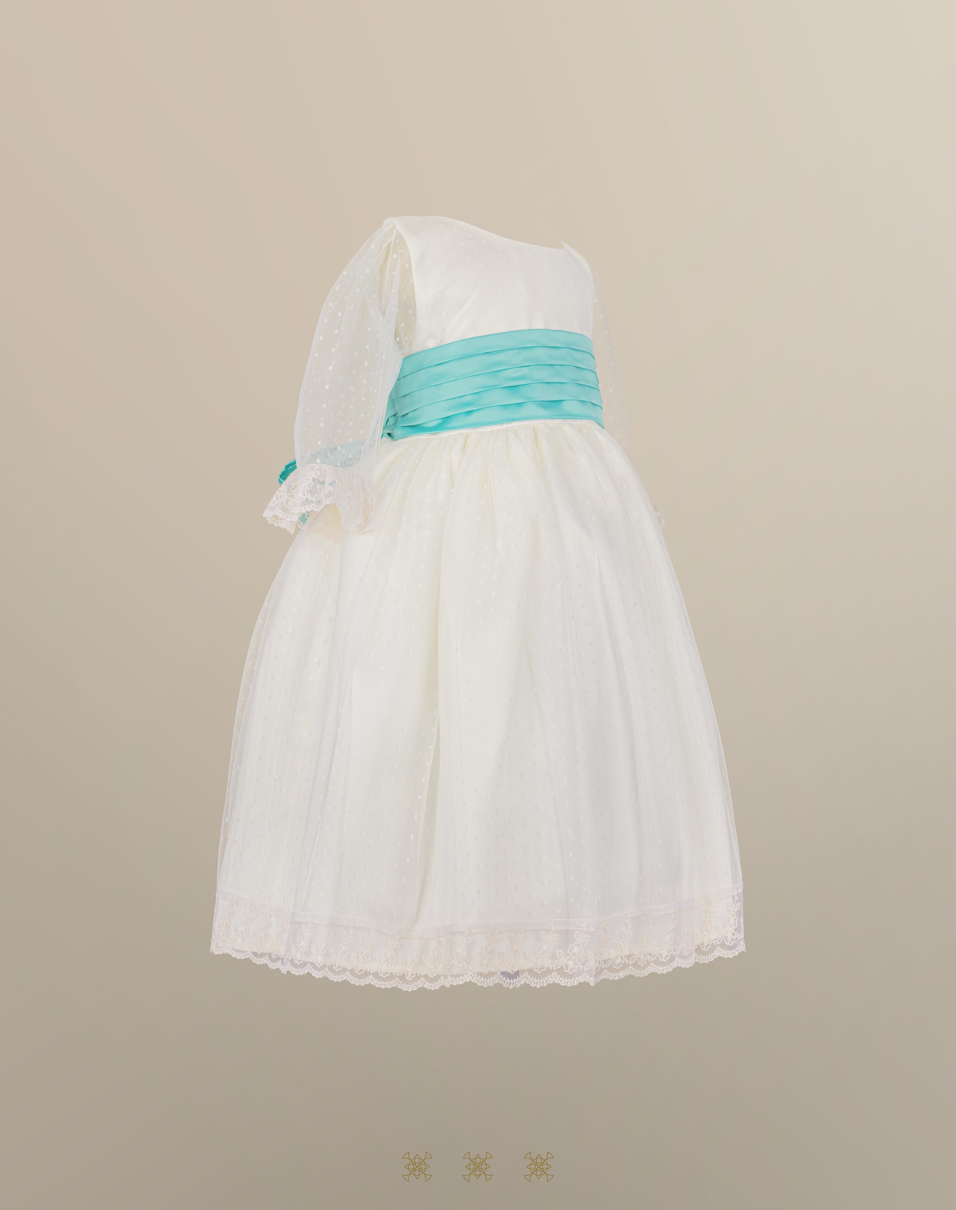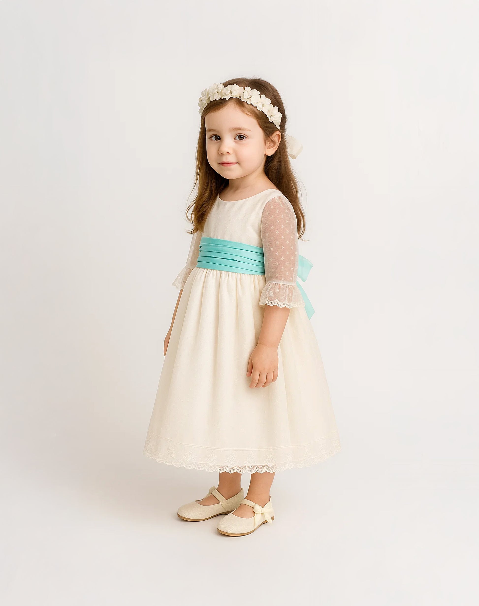 Vestido infantil corto, de tul con puntos, mangas 3/4 estilo boho y fajo color verde menta. Con detalle de encaje en las orillas de las mangas y parte baja de la falda.