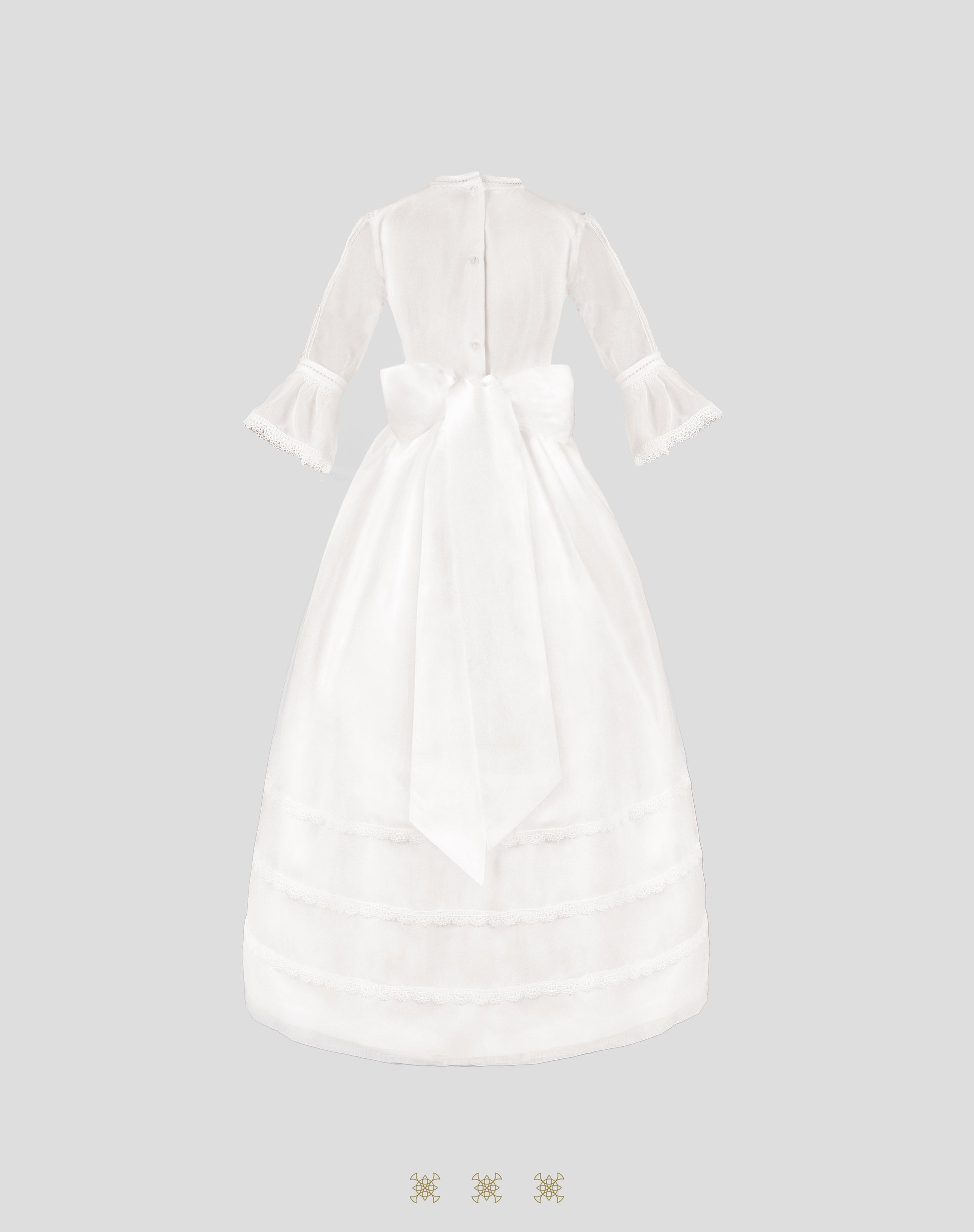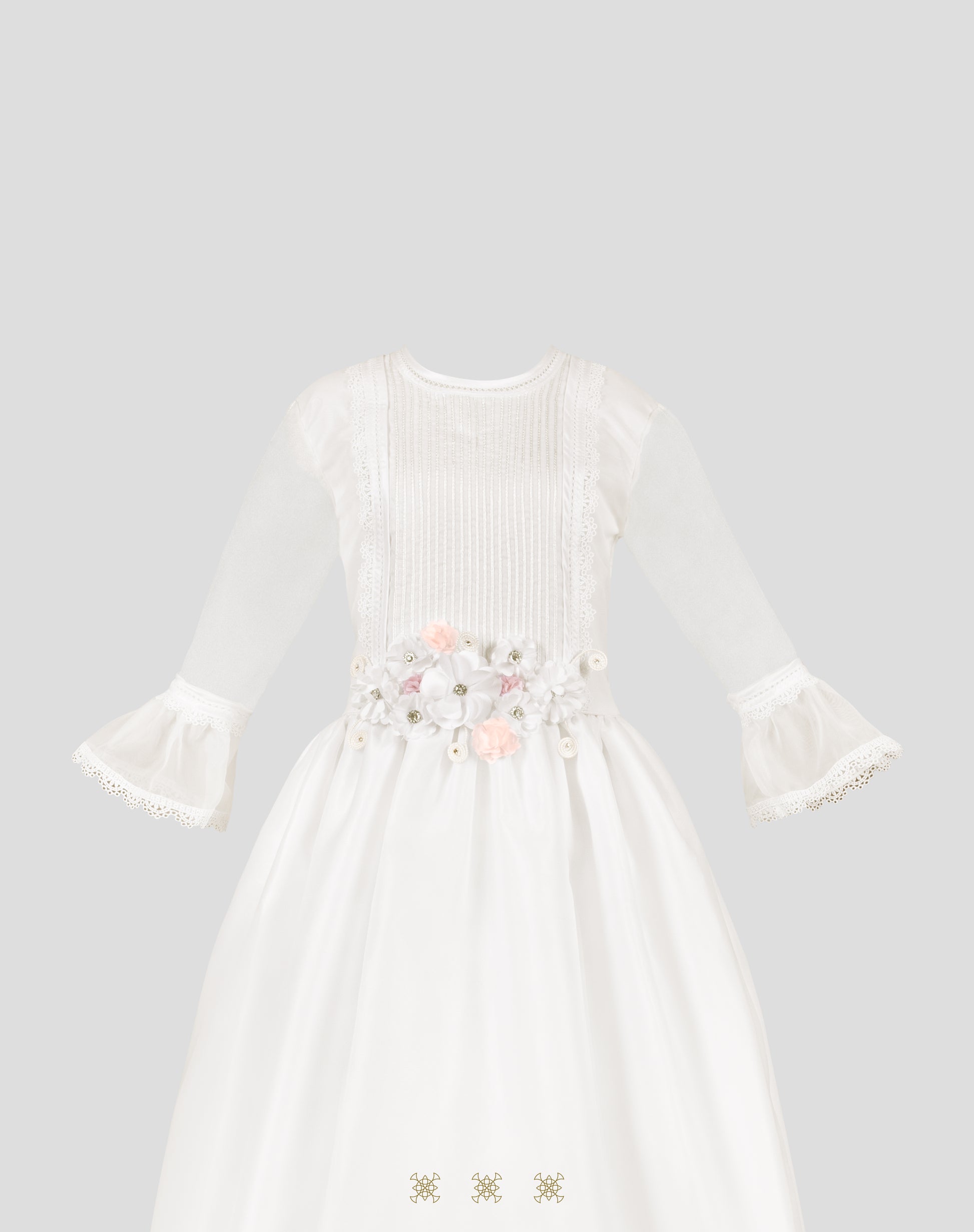 Vestido color hueso con mangas tres cuartos y falda corte A ornamentados con bordados. Fajo frontal con aplicación de flores e incrustaciones de pedrería. Cierre por medio de botones en la espalda.
