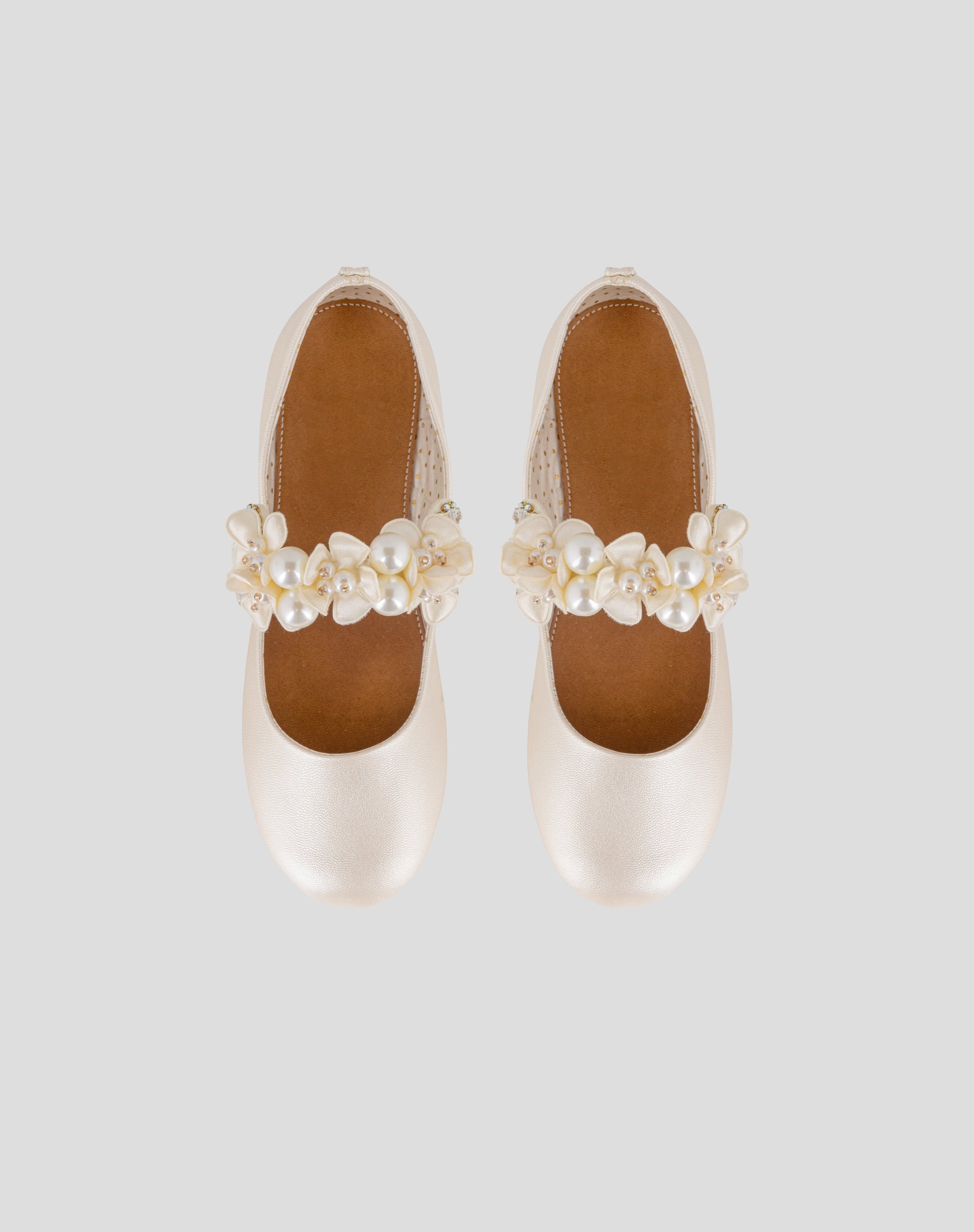Zapatos color ivory con flores de tela y detalles brillantes, cierre autoadherente.